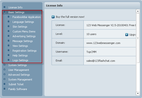 If you want to set Basic Settings for you 123 Web Messenger, please click the node named "Basic Settings" in the Admin Panel. What kinds of configurations can you setup here? Please look at the following picture to get the answer.